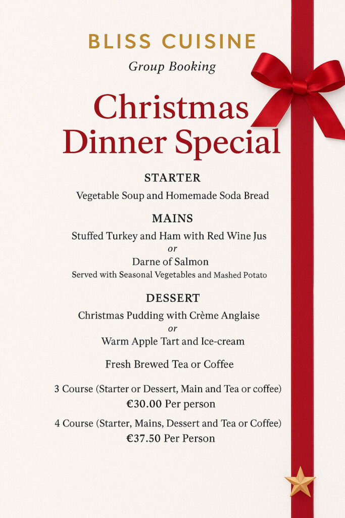 Gather your group and celebrate the season in style with our delicious Christmas Dinner Special by Bliss Cuisine!